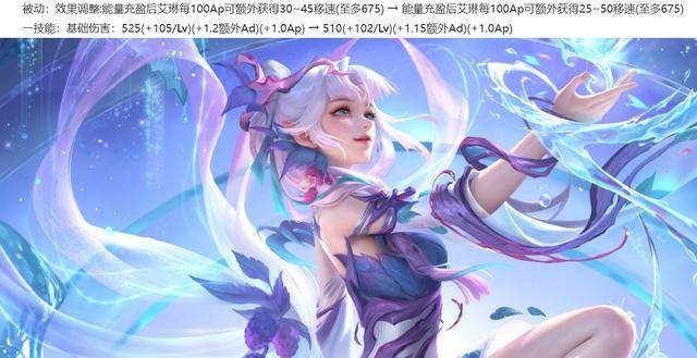 艾琳削弱:被动额外获得的移速在前期降低,在后期增加,1技能的伤害降低。