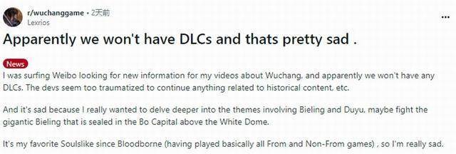该消息也被转至Reddit论坛,引来众多老外围观。网友Lexrios发帖称,如果《明末:渊虚之羽》没DLC消息是真的话,那将是一件让人很难过的事情。
