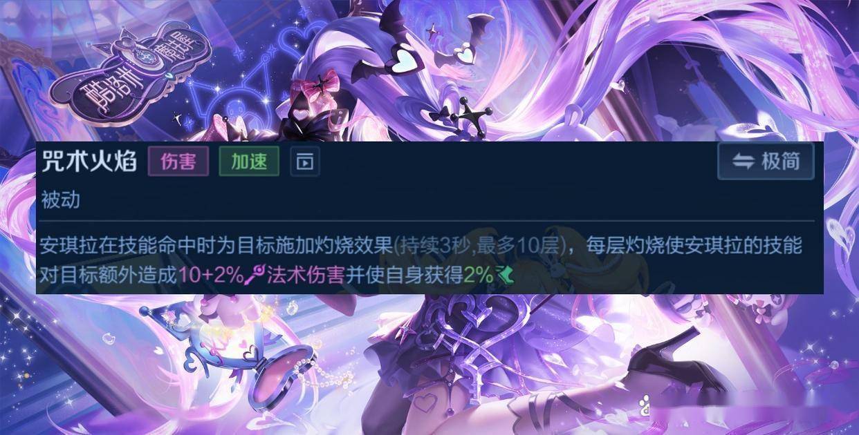 安琪拉的技能命中时会给目标施加一个灼烧效果,最多十层,每层都可以提升技能伤害,还会提供移速。