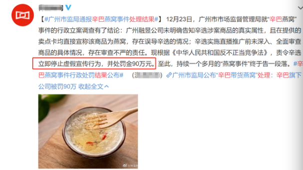 最终12月23日,辛巴团队直播“糖水燕窝”事件等来了官方判定,广州市市场监督管理局通报,对直播间的开办者,即辛巴旗下广州和翊电子商务有限公司,处以行政罚款90万元,对品牌方,即广州融昱贸易有限公司,处以罚款200万元。处罚理由是,双方存在引人误解的商业宣传行为,违反了《中华人民共和国反不正当竞争法》第八条第一款的规定。