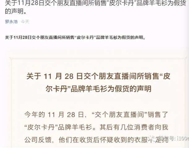 12月15日,罗永浩通过微信公众号发布公告称,其11月28日销售的“皮尔卡丹”品牌羊毛衫,部分送检后鉴定为非羊毛制品,对此,罗永浩相关公司承诺对“所有购买该产品的消费者,代为进行三倍赔付”。