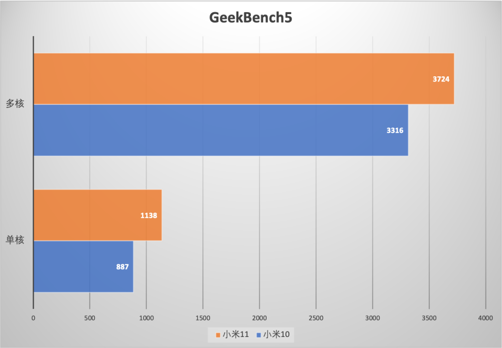 GeekBench5的测试成绩中,小米11处理器的单核和多核性能也都有了提升,单核的成绩提升到了1100分左右,多核的成绩超过了3700分,处理器的整体运算性能在实际的上机表现上提升超过了10%。