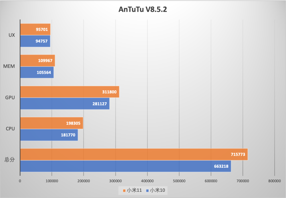 AnTuTu的测试中,骁龙888的成绩超过了71万分,尽管没有达到高通声称的73万这么多,但整小米11整体的素质已经高于了小米10至尊纪念版,之前小米10超大杯的成绩最新版的AnTuTu上测试成绩在66万左右。