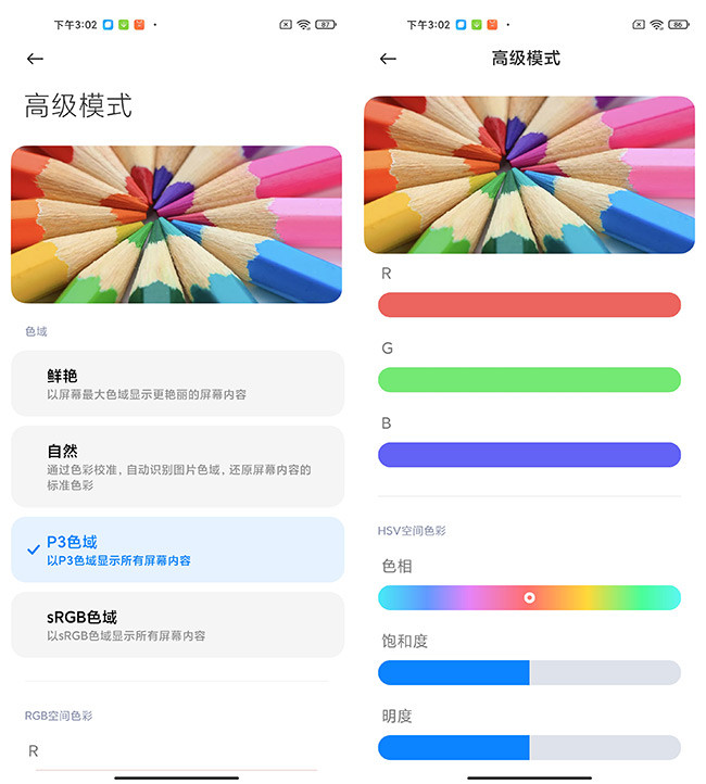 系统内提供了四种显色模式供用户选择,包括了鲜艳,自然,P3色域和sRGB色域,同时系统给了用户充分的自由,可以手动调整画面的三原色,色相饱和度、对比度甚至是伽马值,用户可以根据不同的视觉喜好来对画面的色彩度进行微调。