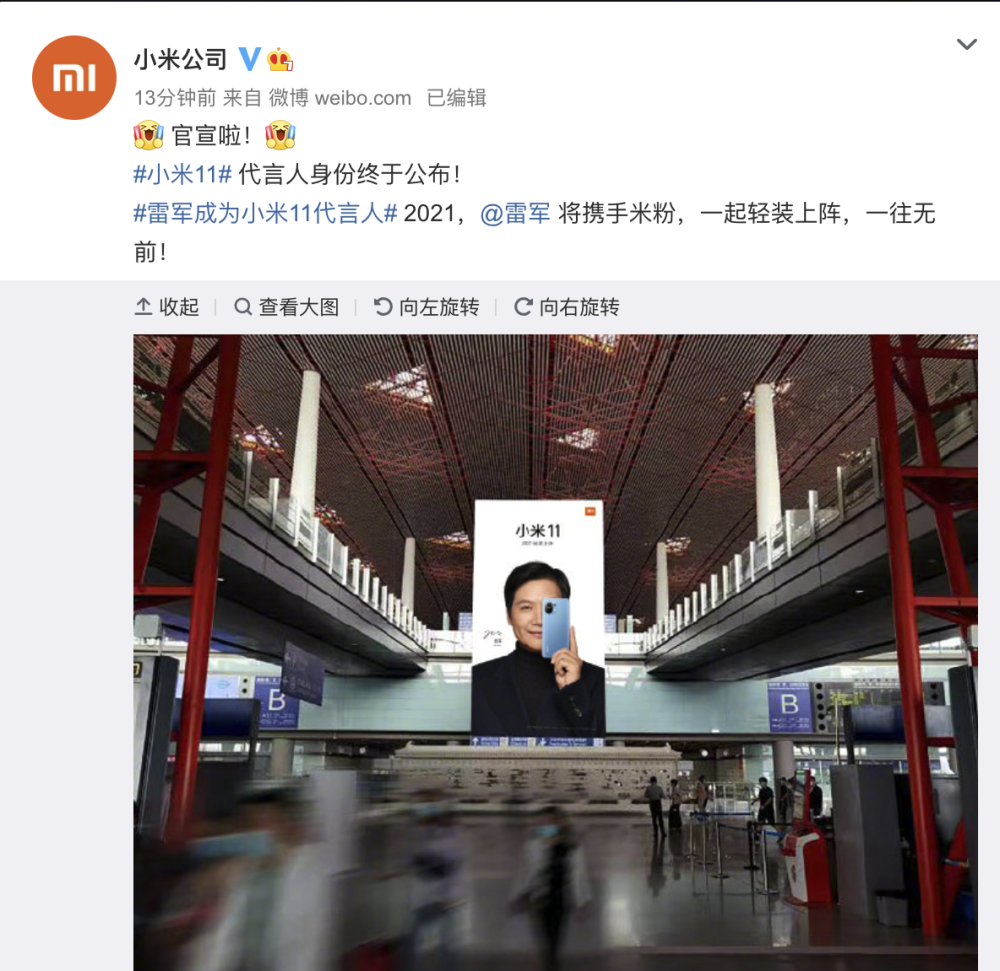 1月1日晚,小米公司官方微博宣布,雷军成为小米11代言人。