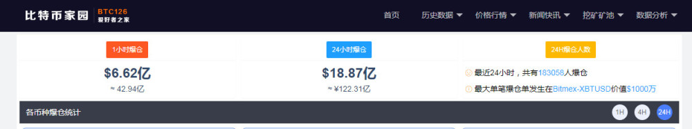 据比特币家园网显示,24小时内已经有18万余人爆仓,爆仓自己达到18.87亿美元,约合人民币122.31亿元。