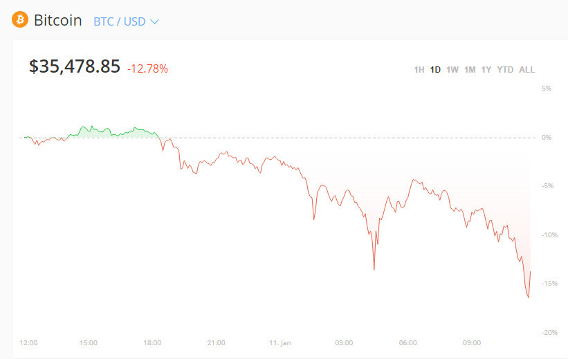 周一(1月11日),比特币持续走低,比特币跌幅一度扩大至12%,跌破33500美元/枚。以太坊跌至1070美元/枚下方,日内跌14.81%。莱特币日内跌超20%,现报136.41美元/枚。