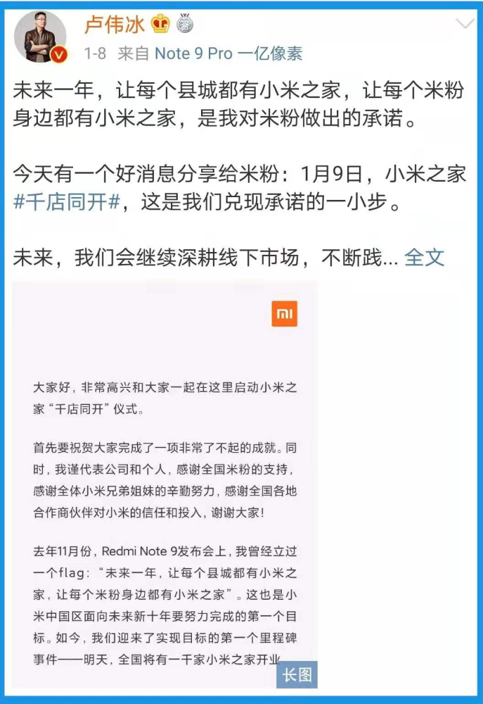 1月8日,卢伟冰通过公开信表示,千店同开正是兑现承诺的一小步。