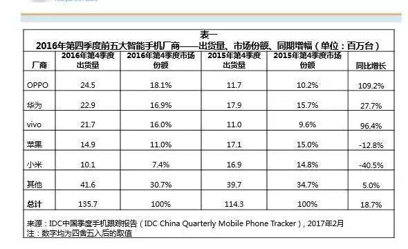 那一年,华为、OV成为中国智能手机市场全年出货量前三,其中OPPO的增长率高达122%,首次成为年度冠军。