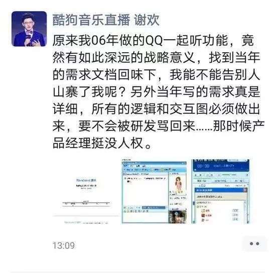 在该微博发布后不久,酷狗音乐副总裁谢欢在朋友圈发文疑似回应此事:“原来我06年做的QQ一起听功能,竟然有如此深远的战略意义,找到当年的需求文档回味下,我能不能告别人山寨了我呢?”同时,谢欢还贴出2006年至2007年间写的产品需求文档截图,反驳网易云音乐称“一起听”被抄袭一事。