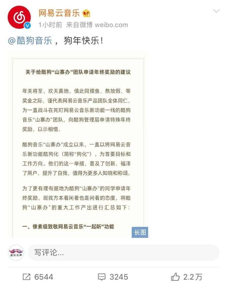 网易云音乐的配图长文名为《关于给酷狗“山寨办”团队申请年终奖励的建议》,以反讽口吻历数了酷狗音乐“山寨办”成立以来,一直以将网易云音乐新功能酷狗化,如像素级致敬网易云音乐“一起听”功能、“山寨办”初战致敬网易云音乐“云贝推歌”。