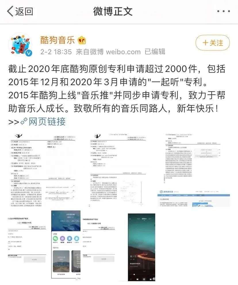 下午18点35分,酷狗音乐官微正式针对此事做出回应,称“截止2020年底酷狗原创专利申请超过2000件,包括2015年12月和2020年3月申请的"一起听"专利。2015年酷狗上线“音乐推”并同步申请专利,致力于帮助音乐人成长。致敬所有的音乐同路人,新年快乐”,并贴出了专利申请图,语气云淡风轻,尾巴上的网页链接点开后是周杰伦的《黑色幽默》。
