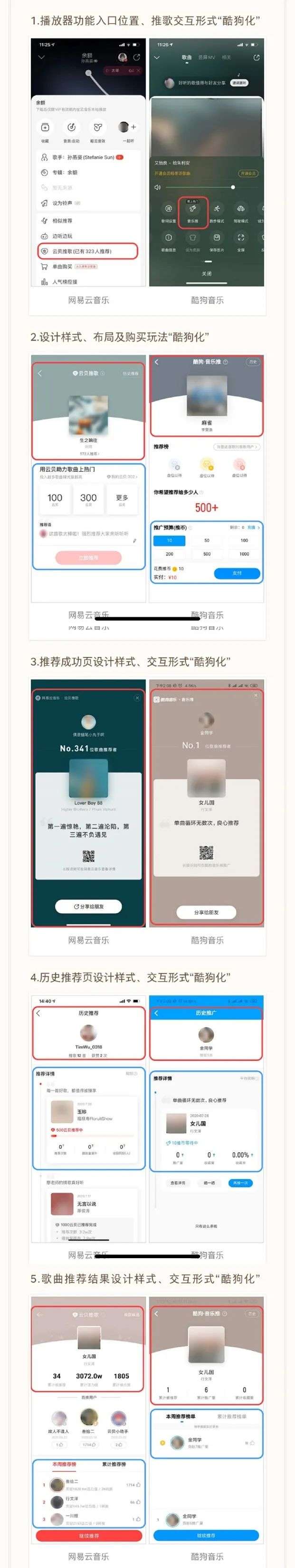 网易云音乐在2020年4月份的7.1.10版本上线“云贝推歌”功能:粉丝可以用“云贝”为喜爱的音乐进行推广和支持。三个月后,酷狗音乐上线了“音乐推”功能,部分内容也与“云贝推歌”功能相似,如播放器功能位置、设计样式、交互形式、布局和购买玩法。