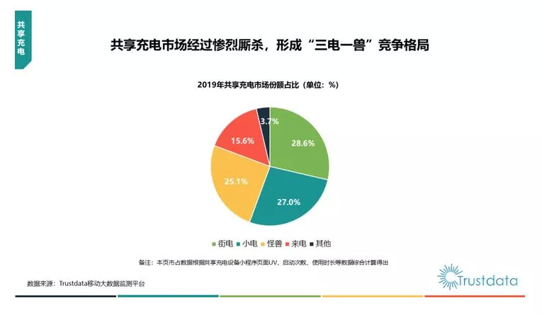 从行业格局看,街电、来电、小电、怪兽充电“三电一兽”的市场格局基本形成。根据TrustData移动大数据监测平台的统计,2019年,上述4家企业的市场份额占比分别为28.6%、27%、25.1%和15.6%。