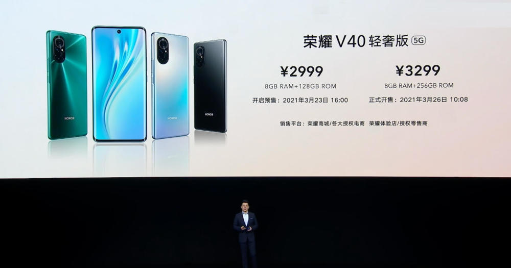 售价方面,荣耀V40轻奢版8GB+128GB售价2999元,8GB+256GB售价3299元。