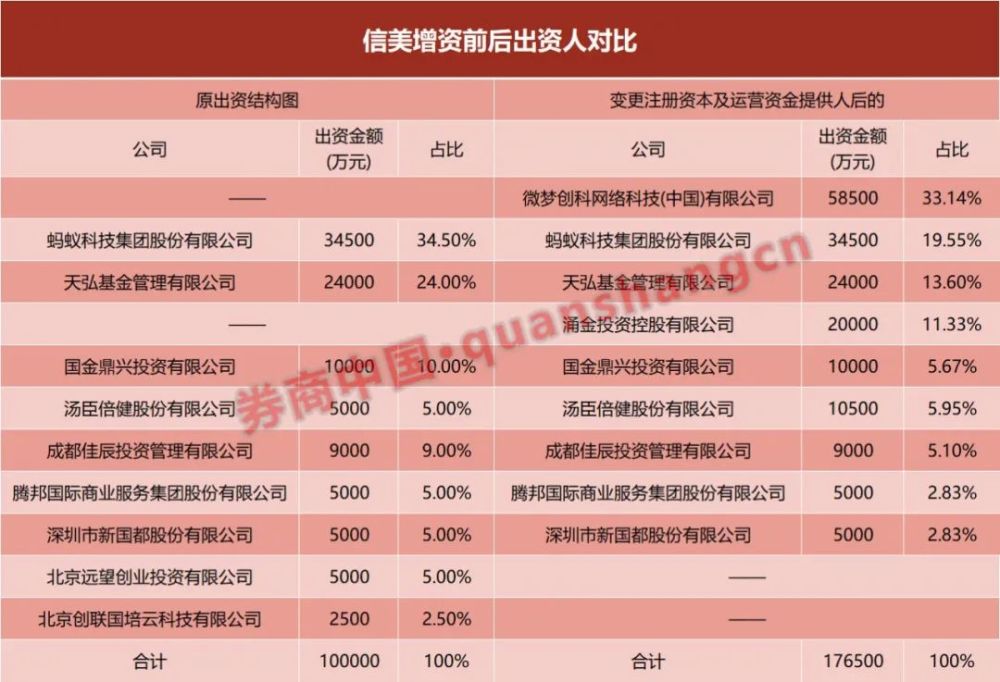 而由于不参与此次增资过程,原第一大出资人蚂蚁科技+天弘基金对信美的出资保持5.85亿元不变,但出资所占比例被稀释,降至33.14%。