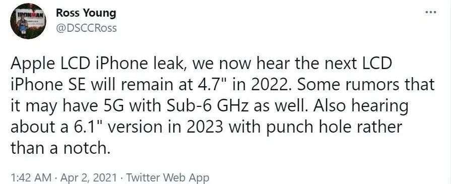 近日,外网知名显示面板业内人士Ross Young透露,苹果预计将在2023年推出采用挖孔设计的新款iPhone SE。据悉,这款产品将会采用6.1英寸挖孔屏,而不是苹果祖传刘海屏。苹果希望通过挖孔设计最大限度地增加可用的显示面积,同时也为前置摄像头留下空间。