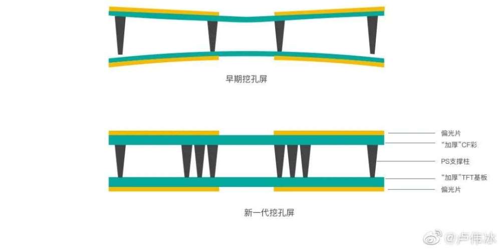 在各家厂商的努力下,这个问题最终得到了妥善的解决。一方面,针对LCD挖孔屏,现在的屏幕厂商会在挖孔周围增加强化玻璃和PS支撑柱,使摄像头挖孔附近的屏幕结构保持稳定。另一方面,国产OLED挖孔技术不断成熟,越来越多的国产厂商开始选用OLED挖孔屏,从源头解决液晶层不均匀导致泛黄的问题。