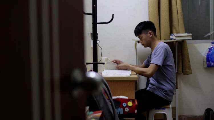 男生宿舍里,外放视频声混杂着各类游戏声、聊天声,在这样嘈杂的环境里,“怪人”学贵需要从机械化的体力劳动快速切换到高强度的脑力劳动,在两三个小时仅有的休息时间里集中注意力、吸收知识。