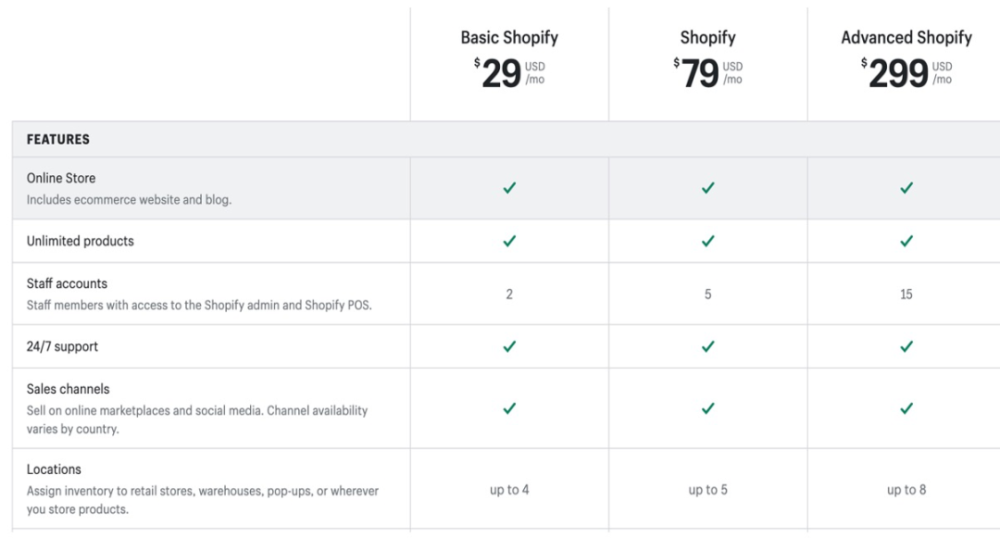 卖家最关心的费用问题,Shopify并没有像其他平台一样收取高额交易佣金,而是采用月订阅制方式,根据不同范围的服务类型收取每月29-299美元的服务费。此外,Shopify还针对不同需求的卖家提供了各种不同的销售模式,你既可以选择自己建站,也可以绑定自己的社交账号作为营销渠道,还可以在任意网站上嵌入产品信息和购买按钮。