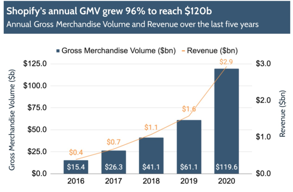2020年,Shopify的全球商家商品交易总额(GMV)增长了96%,卖家已经遍及全球175个国家,有超过158万个网站基于Shopify运行,而2021年一季度,其营收和GMV双双同比增长100%以上,继续保持着高涨的势头。