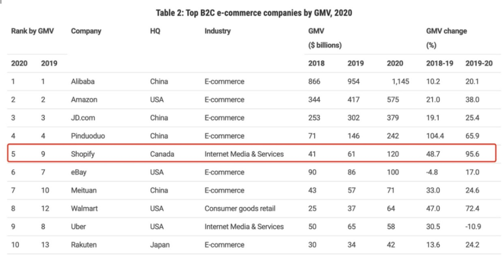 本月初,联合国贸易与发展会议发布了一份关于全球电商发展的报告,按照全球商家商品交易总额对各大电商进行了排名。2019年和2020年相比,前四名的座次纹丝不动,依然是阿里、亚马逊、京东和拼多多,但第五的位置却被Shopify强势夺下,并且在2019年-2020年里,Shopify的增长速度远超其他所有平台,登顶全球第一。
