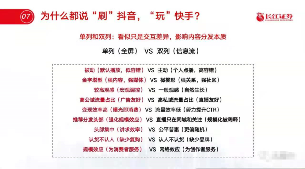 快手则不然。所有用户的推荐都较为平均,获取的流量支持大致都在一个量级。如果主播视频的播放量达到一定天花板,就不会得到公域的推荐了,但是私域还是可以看。也就是说,用户搜索关键词或者点进他的主页里还是可以看到。