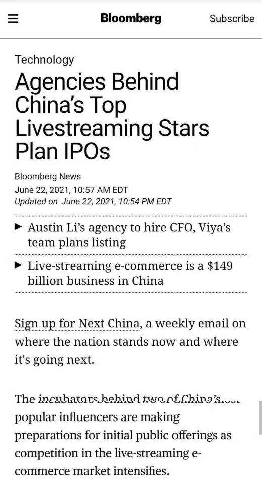而在此前不久,美国时间6月22日来自彭博社的消息显示,李佳琦所属公司美ONE正在寻找一位首席财务官,并酝酿赴美上市,而美ONE拟融资规模将达到3亿美元。这份报道同样指出,薇娅所在的谦寻也正酝酿海外上市。