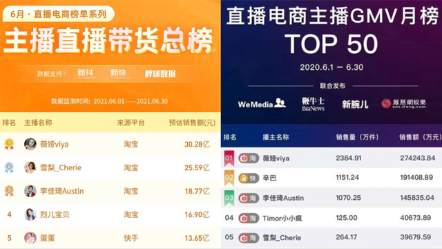 相比明星,MCN公司孵化主播显然有一套更成熟的机制,主播们的表现也更加专业。但薇娅和李佳琦、辛巴等头部主播们,也已经触碰到了自己的瓶颈。和2020年6月数据相比,薇娅在今年同期的总销售额仅增长了不到11%;辛巴在经历了燕窝事件后已经自快手“跌落”;李佳琦原本是稳坐第二,但现在也已经被后来者赶上。