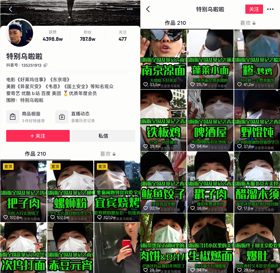 “特别乌啦啦”是一位拥有787.8万抖音粉丝的美食探店达人,居于最新一期探店团榜单的首位。据新榜旗下新抖数据显示,截至目前,“特别乌啦啦”已有三条视频点赞量超过100万,均被设置为主页置顶。
