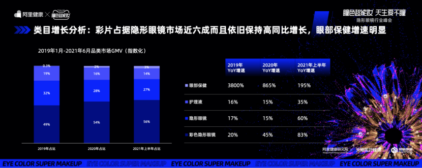 由于新患近视的群体大多为Z世代青年,而他们大多数更看重个性化与颜值,而彩瞳产品能够兼顾视力矫正和搭配妆容的双重属性,自然受到了年轻用户群的追捧。7月21日,阿里健康旗下天猫医药健康平台在隐形眼镜行业峰会中发布的《天猫隐形眼镜行业人群洞察白皮书》(下称《白皮书》)显示,彩片(彩瞳)如今已占隐形眼镜市场近六成且保持高同比增长。