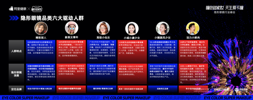 《白皮书》中总结了天猫上隐形眼镜品类的六大驱动人群,分别是精致丽人、新贵女青年、高级小仙女、小城小康少女、小镇跟风少女、活力小鲜肉。在各个细分人群中,有16-24%的消费者选择了无度数彩瞳,25-27%的消费者选择了低度数彩瞳(1-299度)。通常来说,低度数人群在日常生活中并没有刚性的视力矫正需求,这也就意味着,不少彩瞳消费者更多把彩瞳当做美妆工具,而非视力矫正工具。