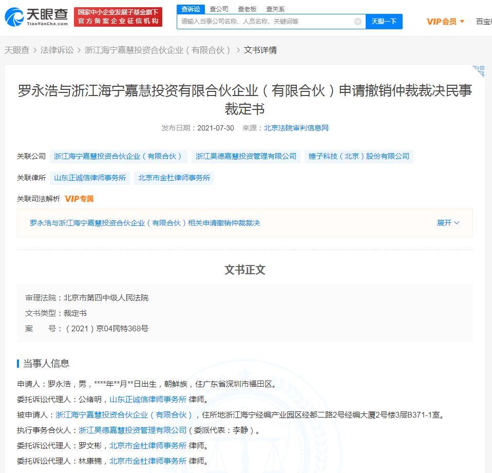 天眼查App显示,近日,罗永浩与浙江海宁嘉慧投资有限合伙企业(有限合伙)申请撤销仲裁裁决民事裁定书公开,案号(2021)京04民特368号,审理法院为北京市第四中级人民法院。