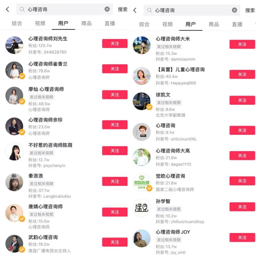 在抖音上搜索“心理咨询”,立马就能找到数十位“心理咨询师”。他们保持着周更甚至是日更的更新频率,探讨两性婚姻、原生家庭、自我心理调节,用一个又一个几分钟、或是几十秒的短视频慰藉着屏幕前的灵魂。