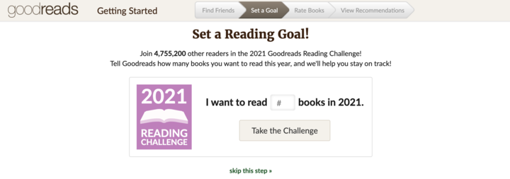 从产品特点来说,Goodreads 的产品其实很简单。在 Goodreads 官方网站注册后,平台会鼓励你将邮件地址配对,从网站 9000 万会员中找到你认识的好友或邀请新好友评分。注册后,Goodreads 还会让你制定一个读书目标,今年内读完多少本书。