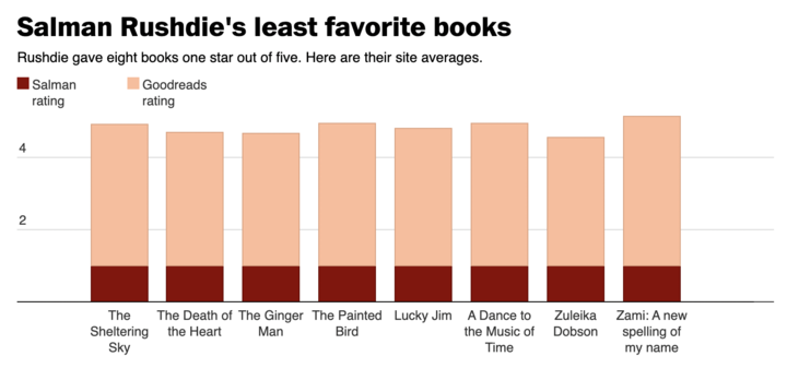 ▲ 萨尔曼·鲁西迪给了八本书一星评价,它们都是平台上的高分书籍. 图片来自:华盛顿邮报