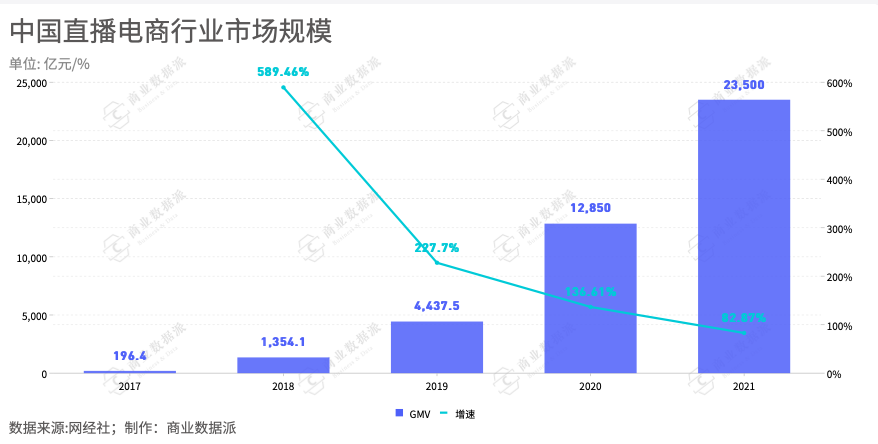 在国内,直播电商已经走过爆发期,GMV增速已经大幅下降。据网经社电子商务研究中心发布的《2021年(上)中国直播电商市场数据报告》显示,预计2021年中国直播电商市场规模达到23500亿元,同比增长82.87%,而2020年这一增速还在136.6%。与此同时,直播电商渗透率预计2021年达10.15%,增长达18.02%,正在成为电商常态。