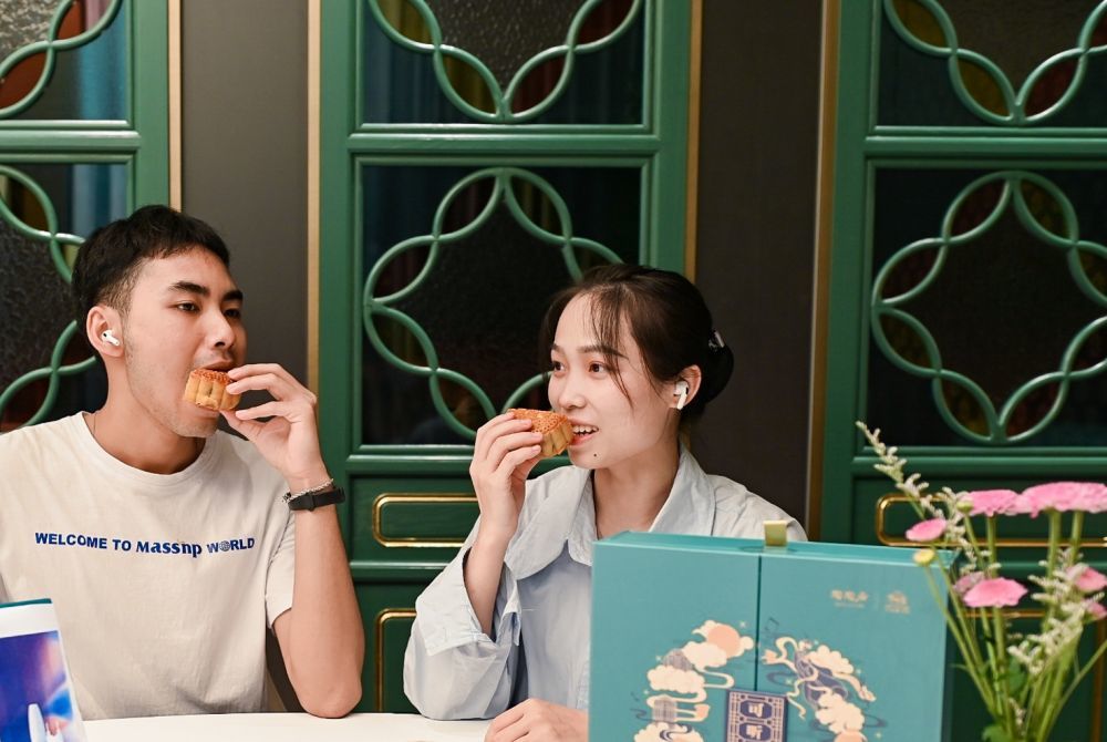 消费者边听粤曲边尝广式月饼。新华社记者王丰通联
