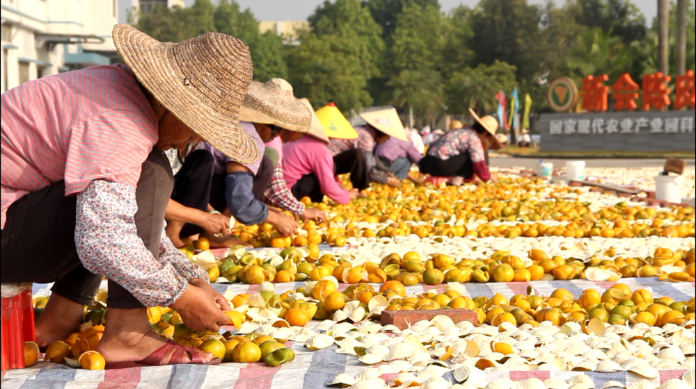 新宝堂员工在翻晒陈皮(资料照片)。新华社记者王丰通联