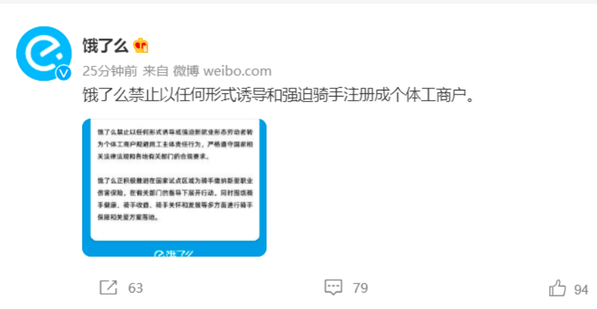 9月15日,饿了么发文称,饿了么禁止以任何形式诱导或强迫新就业形态劳动者转为个体工商户规避用工主体责任行为,严格遵守国家相关法律法规和各地有关部门的合规要求。