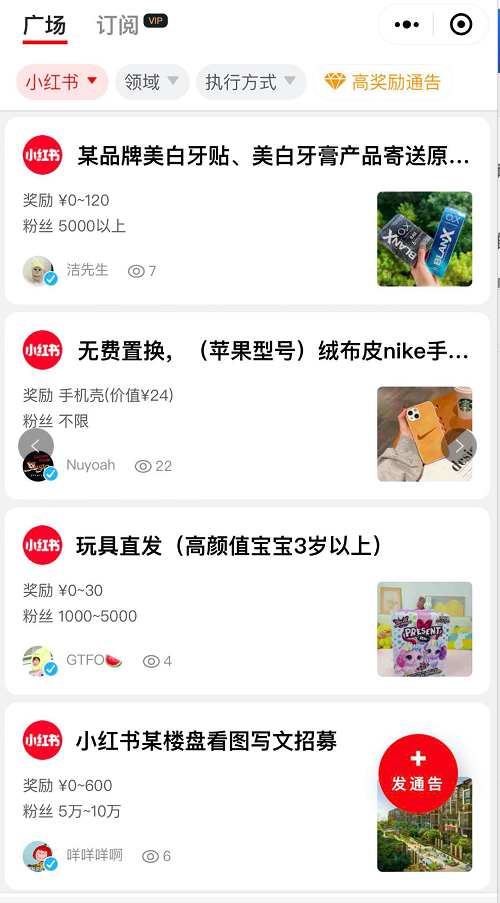 像周萌一样,想通过小红书获取收入的人还有很多,也由此催生出了一批“职业团队”。这些“职业团队”会招募写手,发布“素人笔记”,为品牌做推广。一开始是在微博、豆瓣等平台发布招募信息,后来更是衍生出“通告小程序”。