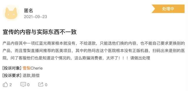 在黑猫投诉平台上,针对雪梨直播间的投诉内容,就有不少与医美产品相关。