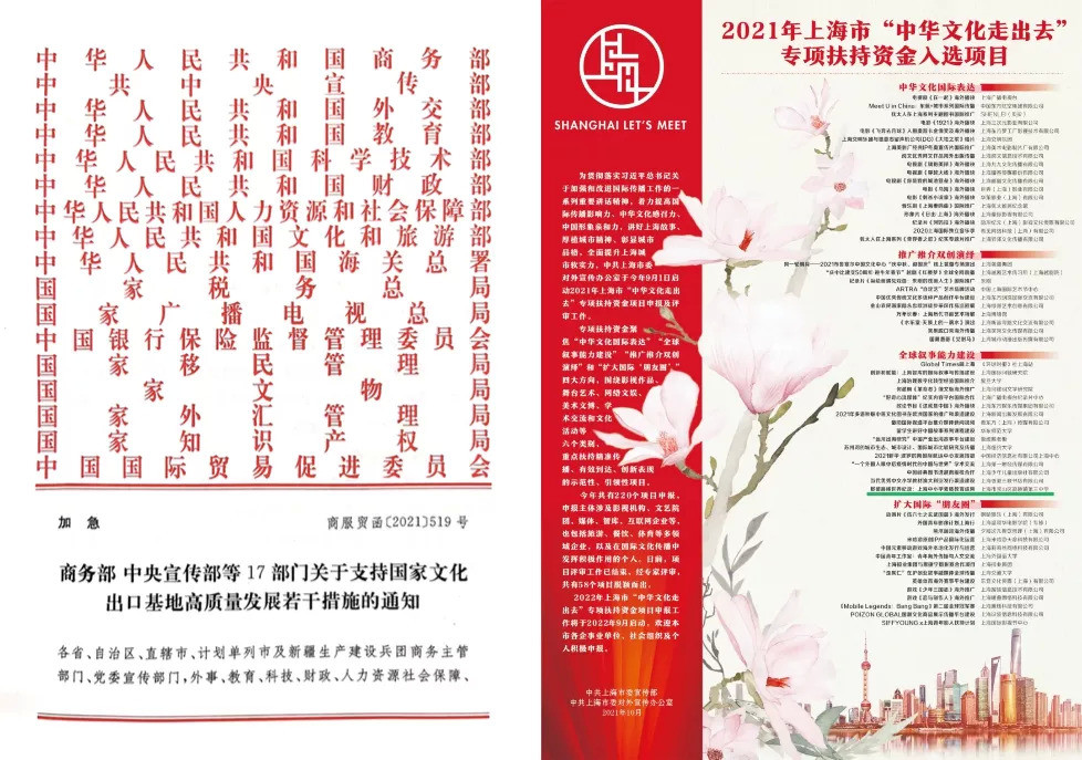 10月25日,商务部、中央宣传部等17部门发布关于支持国家文化出口基地高质量发展若干措施的通知。同日,上海方面宣布启动“中华文化走出去”专项扶持资金项目申报及评审工作,有包括影视剧项目在内的58个项目脱颖而出。