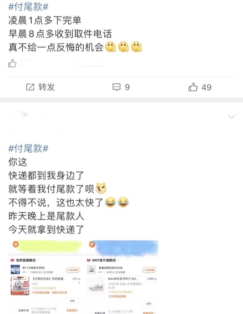 双11走至第13年,“付尾款”话题在11月1日登上新浪微博热搜第一。