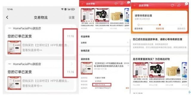 11月1日上午11点14分左右,吴女士的两个订单都付了尾款,并再次咨询客服退款事宜,客服回复需在线申请退款,退款原因为多拍/拍错/不想要。两分钟后,提交了退款申请的吴女士同时收到物流发货信息,退款信息也同时显示,等待商家处理时间为1天22时34分。