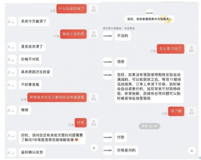 双十一最让人无奈的莫过于,提前半个多月付定金抢优惠,付完尾款后却收到“直播售价”比“预售价”更便宜的信息。不仅如此,商家已神速发货,消费者只能与商家沟通退款、退货事情。