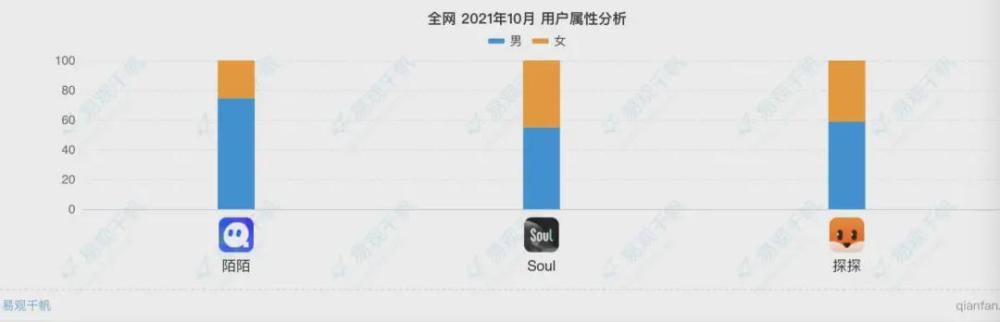 陌陌、Soul、探探用户性别占比比较 来源 / 易观千帆
