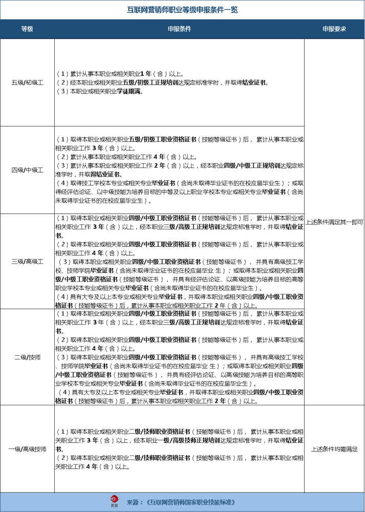 此外,《技能标准》还规定,互联网营销师必须从事本职业或相关职业1年及以上,才能申请五级/初级工;取得五级/初级工证书、从事本职业3年以上,或者累计从事本职业4年及以上,才能申报四级/中级工。此后再申请“升级”,则需进行培训。