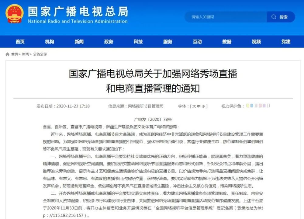 值得关注的是,今年11月23日,国家广播电视总局发布关于加强网络秀场直播和电商直播管理的通知(下称通知),不仅要求网络秀场直播平台对网络主播和“打赏”用户实行实名制管理,同时还专门对头部主播的监管提出了要求。