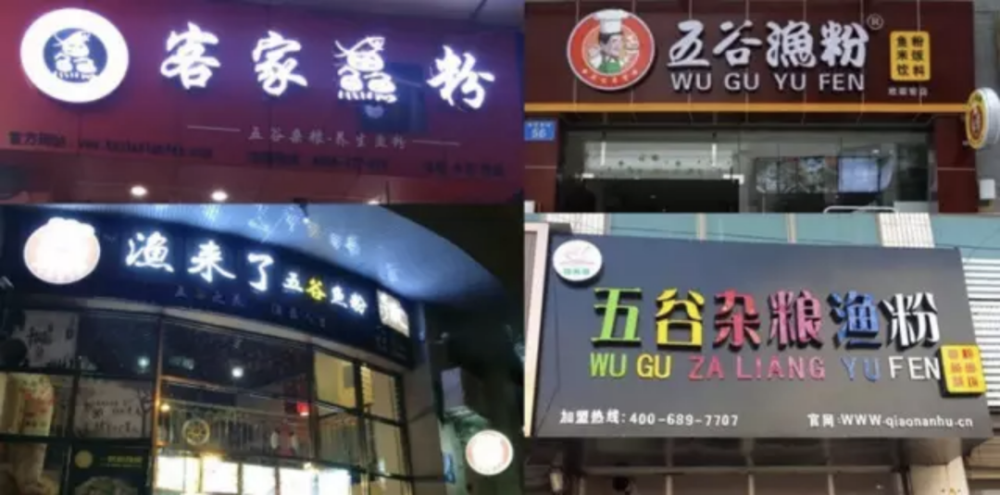 另外,从品类角度看,前文我们也有提到,很多鱼粉品牌的出现都是受到“五谷渔粉”品牌的影响,但纵观的鱼粉市场,很多餐饮创业者都有着同样的品类认知障碍,他们将“五谷渔粉”品牌等同于品类,很多鱼粉品牌都在品牌名字上带上了“五谷渔粉”“五谷鱼粉”四个大字。